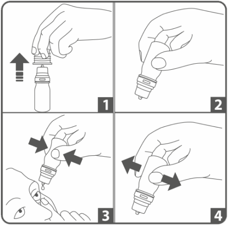4. Ścisnąć pojemnik i zakroplić po 2 krople do każdego oka, chyba że zalecono inaczej.